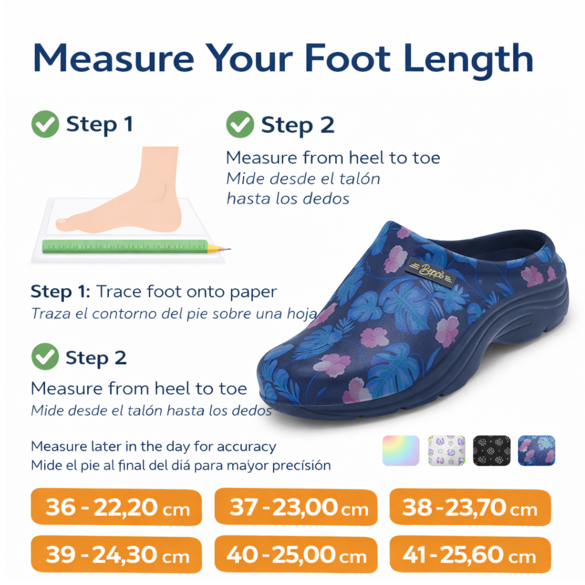 Tabela de tamanhos da palmilha interna: 36 = 22,2 cm | 37 = 23 cm | 38 = 23,6 cm | 39 = 24,2 cm | 40 = 25 cm | 41 = 25,6 cm